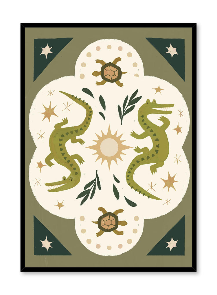 There’s no party like a reptile party! The ‘Reptilian Fun’ poster features playful crocodiles and turtles having a blast. These animals are surrounded by nature and a lovely green decorative frame. Your kids will love this colorful composition. Find this poster and other animal posters like it at Opposite Wall.