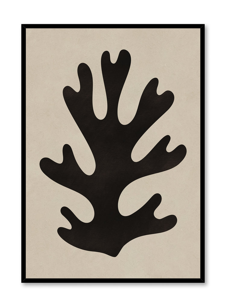 This minimalist print presents a black silhouette of coral or seaweed against a warm beige background. Curated for Keefer House, the work reflects an Asian minimalism influence through its confident use of negative space and organic forms. The flowing, branch-like shape echoes calligraphic brushstroke rhythms.