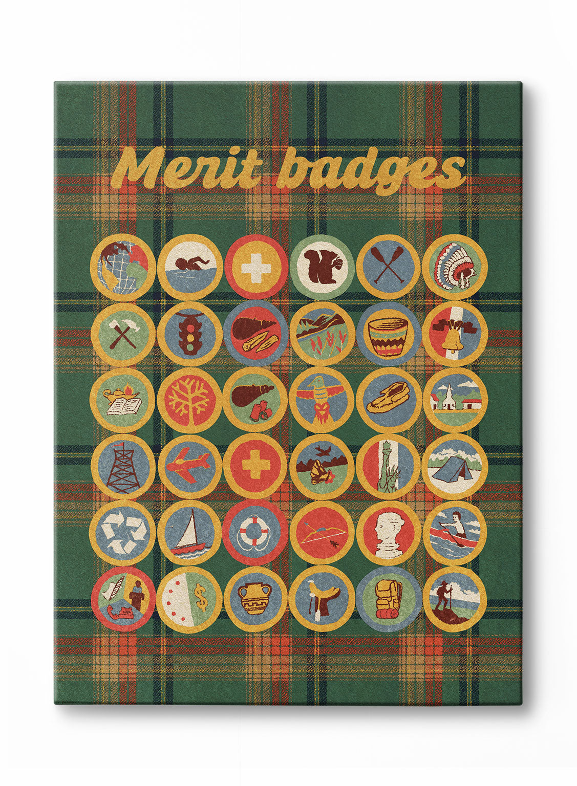 Celebrate the achievements of scouting with this vibrant art print featuring a collection of merit badges. Set against a green plaid background, the badges in red, blue, yellow, and white add a nostalgic touch to any room.