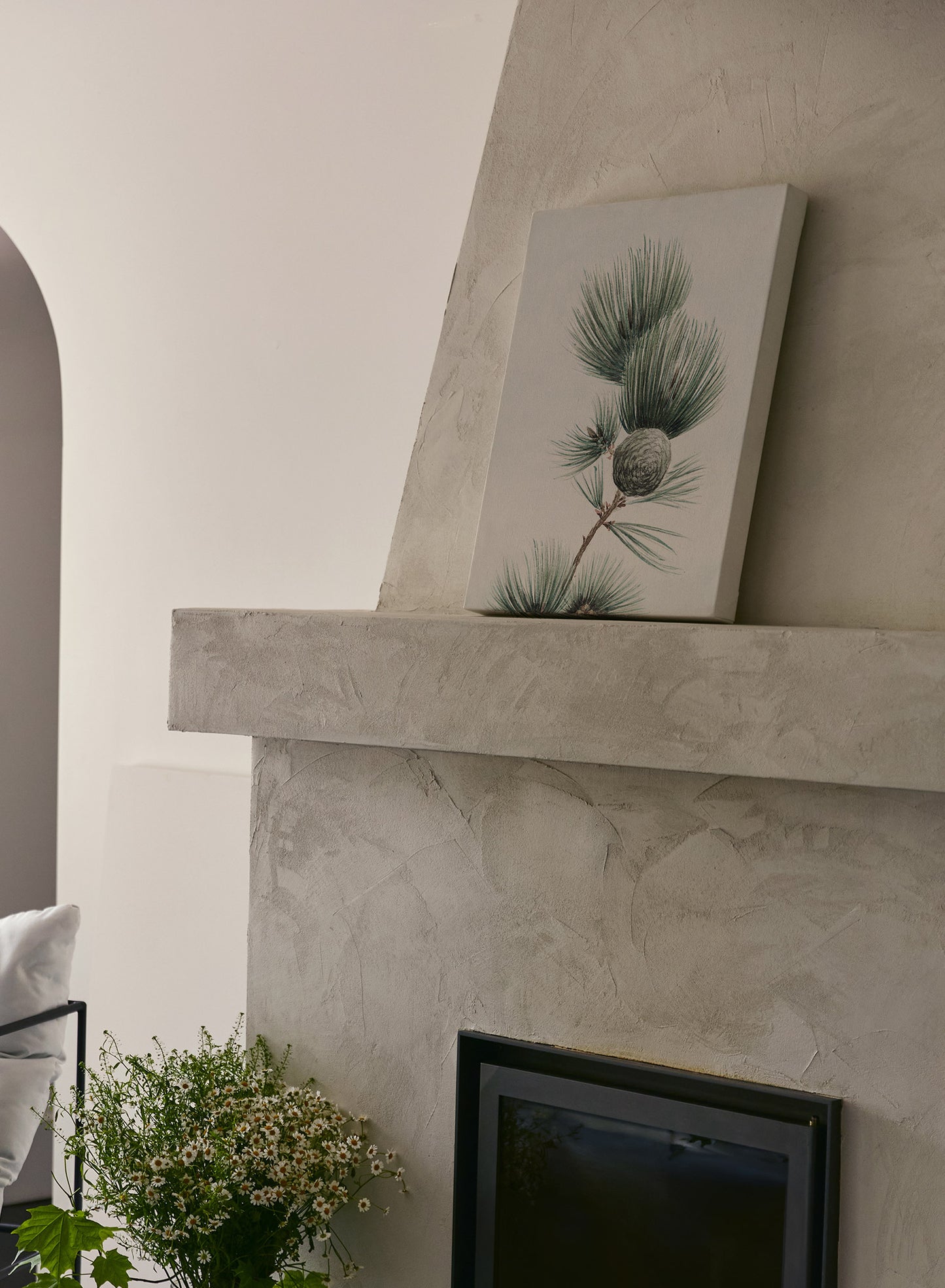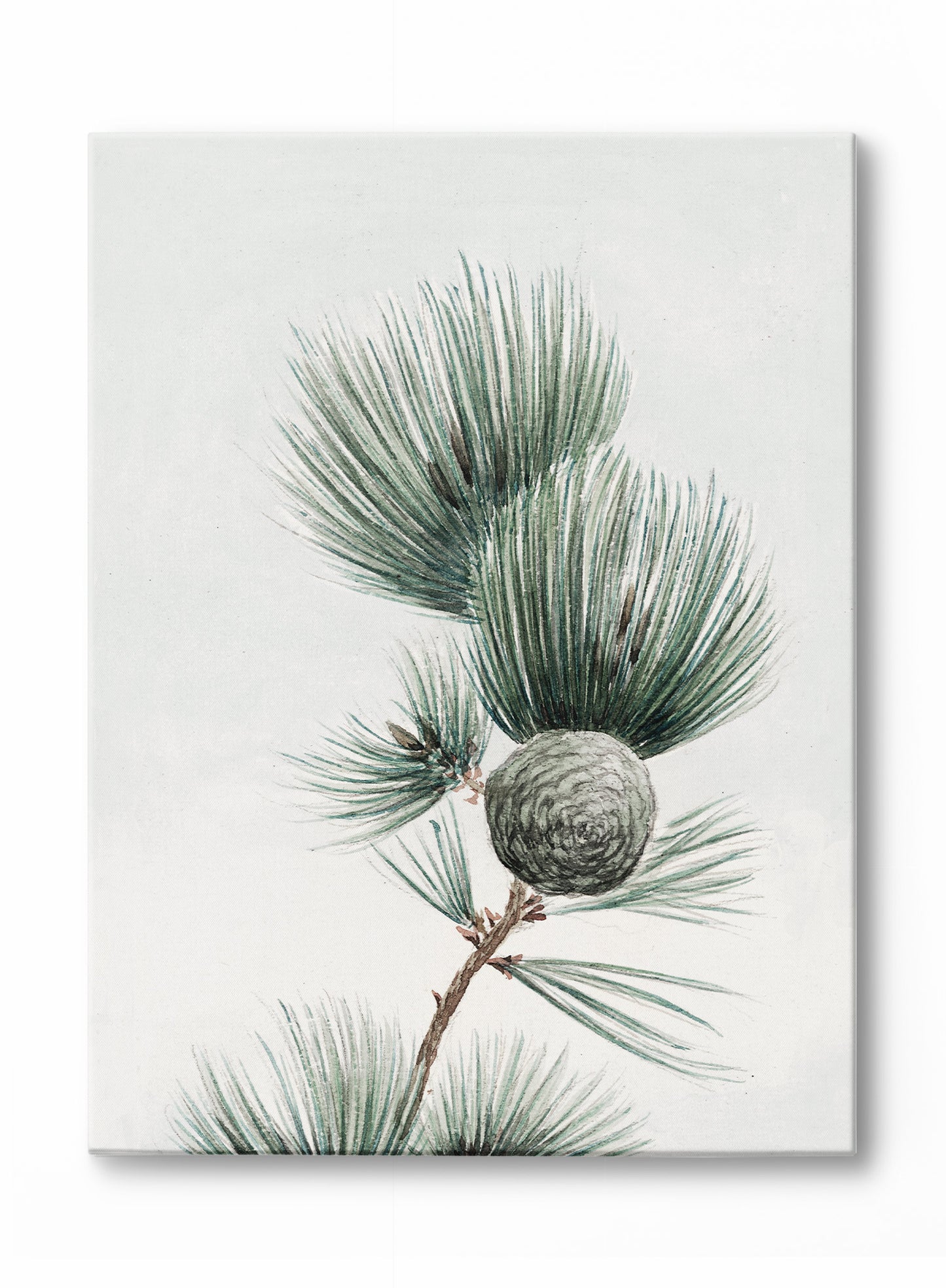 Teleport to a tranquil forest with the 'Seasonal Serenity' poster. This winter-themed botanical print features evergreen leaves and a pine cone on a pine branch.