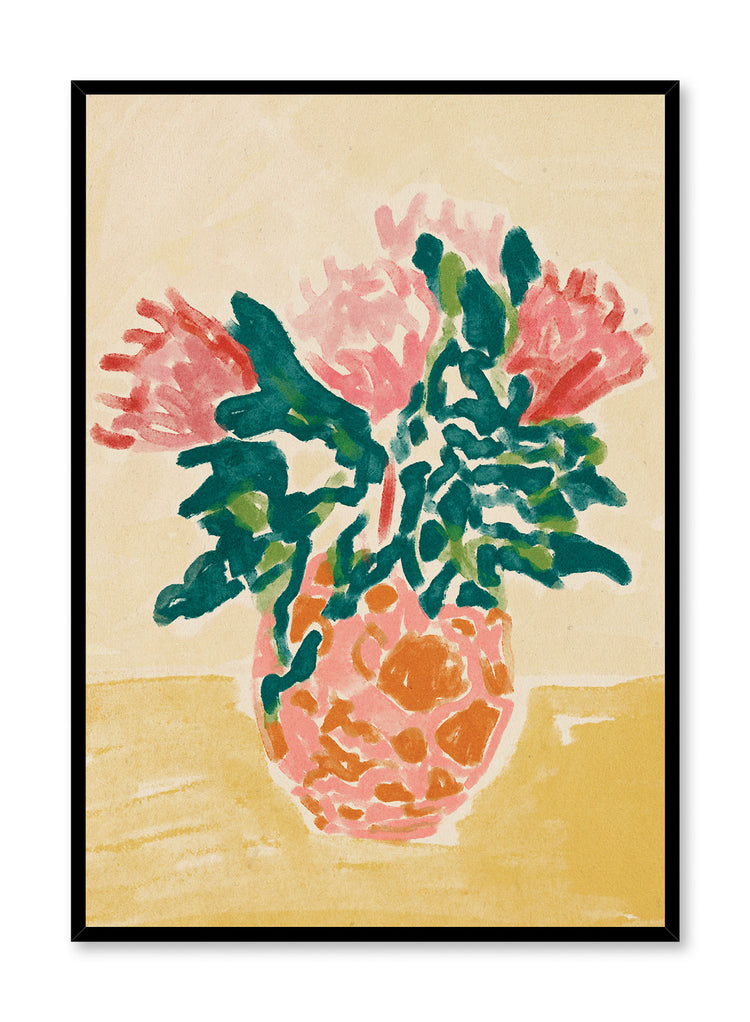 Bring a touch of color and nostalgia to your walls with this painting of pink flowers with green leaves in an orange vase over a textured yellow background.