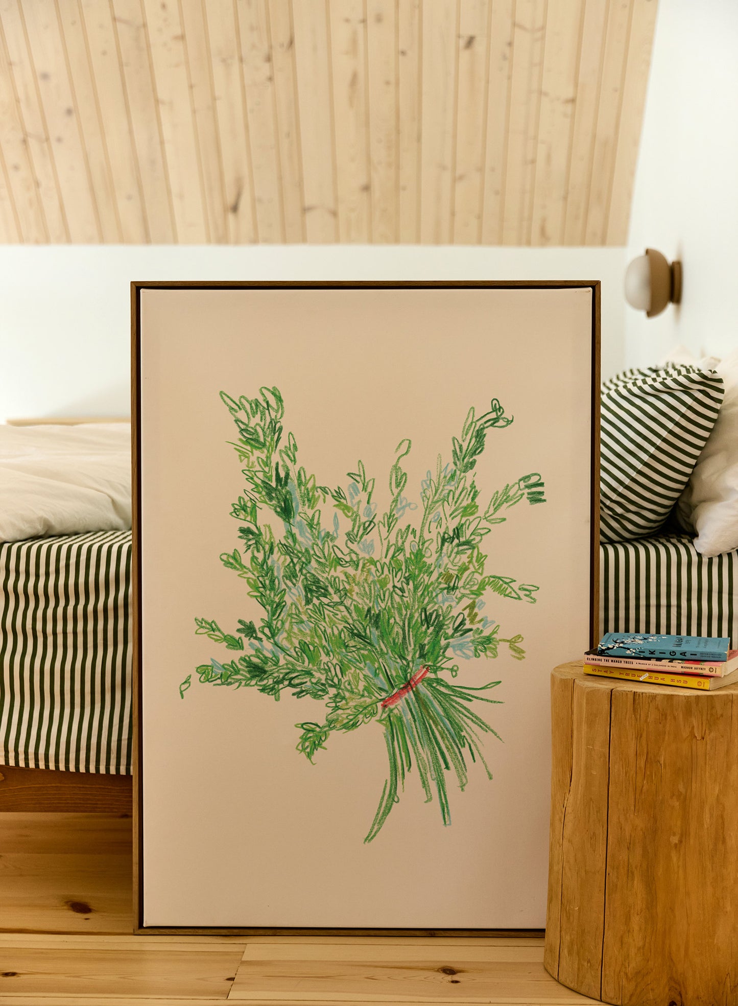A loose, expressive bundle of fresh herbs bursts across this canvas, its lively greens layered with soft blues and hints of earthy browns. The gestural, sketch-like strokes give the piece an effortless, organic energy, as if it were quickly gathered straight from the garden.
