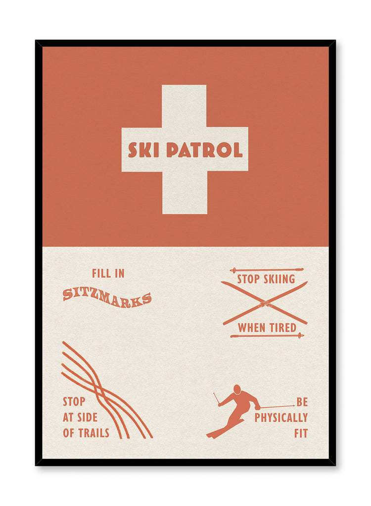 We're all about having fun on the slopes, as long as we can count on the 'Ski Patrol' to keep us safe! This vintage promotional poster features safe skiing rules and the words 'ski patrol' in the middle of the white cross of the red Switzerland flag.