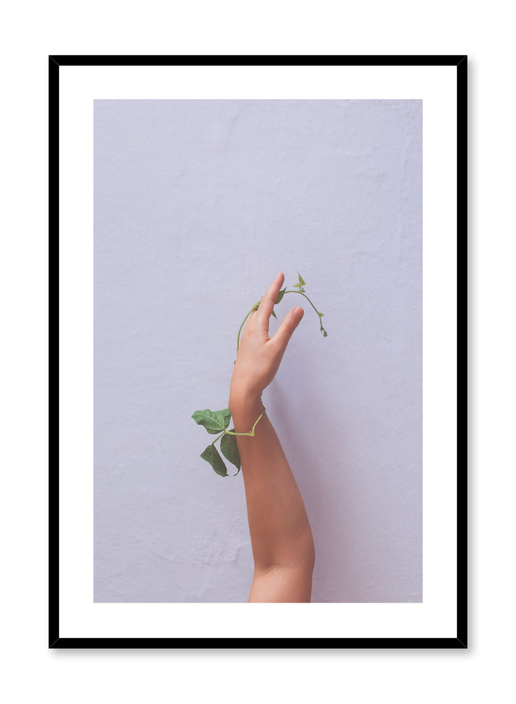 • "Skin & Foliage" is a minimalist photography poster by Opposite Wall of a nude arm and hand entangled with a green leafy stem.