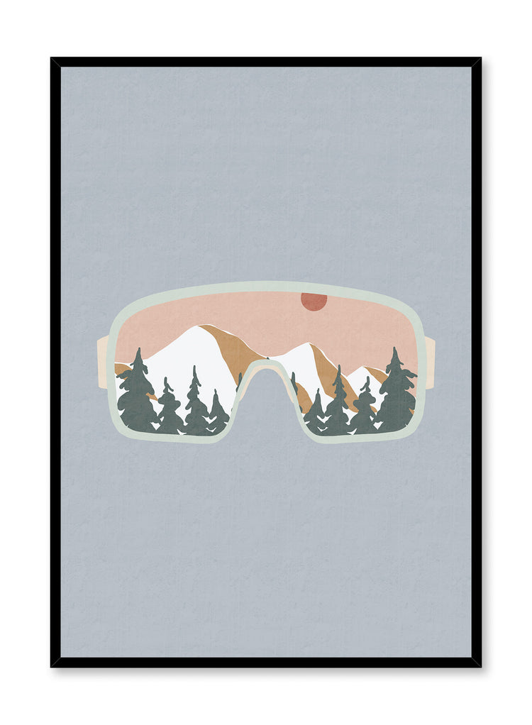 As soon as winter comes around, we start seeing life through 'Snow-Colored Goggles'! In this ski and snowboard-inspired poster, a snowy mountain sunset is framed through ski goggles and layered over a textured powder-blue background.