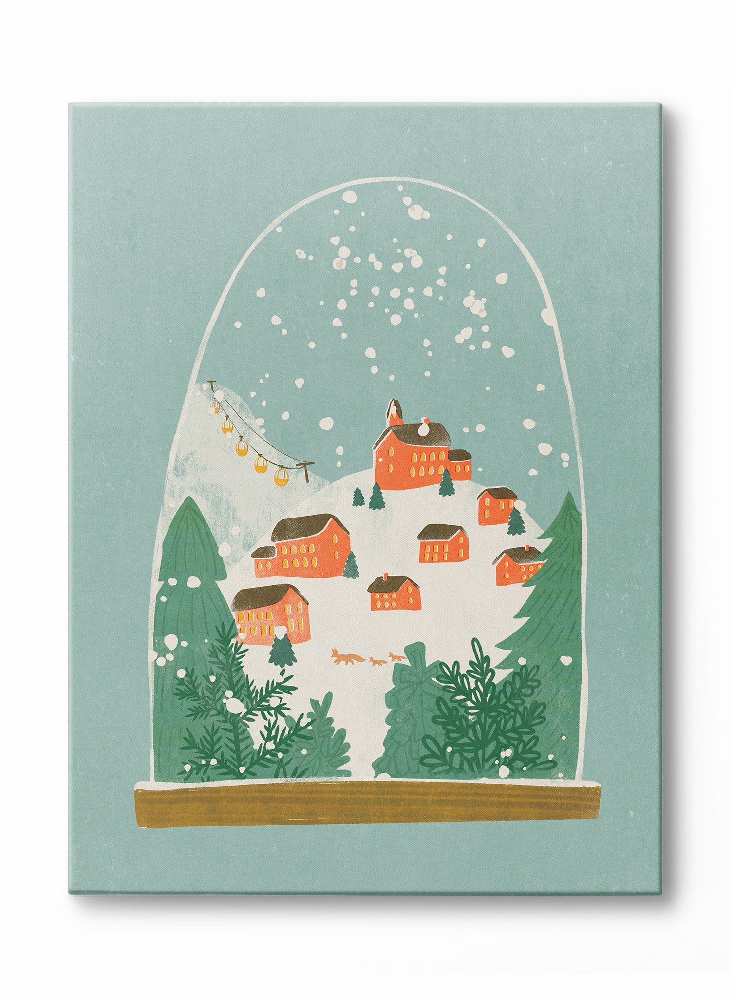 The color palette is a harmonious blend of cool and warm tones, with the teal backdrop providing a calming effect. The vibrant reds and greens of the village and trees add a lively pop, drawing the eye to the intricate details. The texture of the snow globe gives the print a tactile quality, inviting viewers to imagine the gentle snowfall.