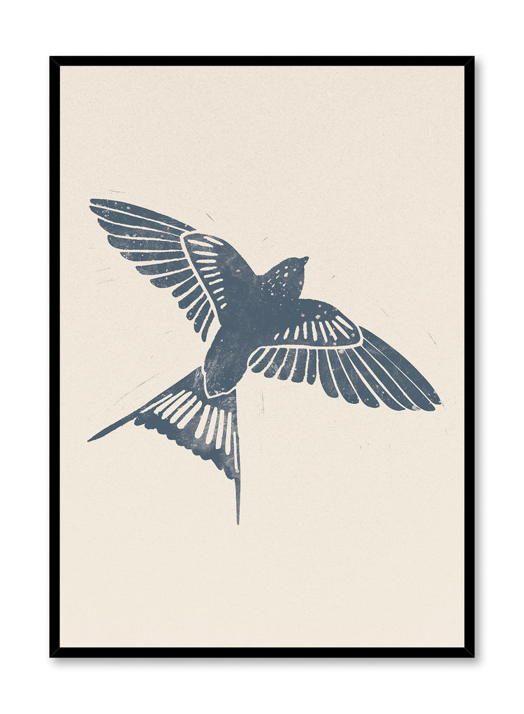 This print captures a striking bird in mid-flight, its wings elegantly spread against a soft, neutral background. The bird's form is rendered in a deep, inky blue, creating a bold contrast that draws the eye. The simplicity of the scene highlights the grace and freedom of the creature, inviting a moment of reflection.