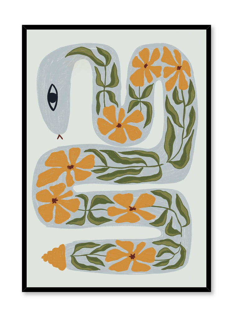 Snakes? Scary? Not this guy! ‘Sssweet Bouquet’ features a lovely floral snake illustration over a baby blue background. Treat your little explorers by decorating their room with this fun snake decorated with bold orange flowers. Find this animal poster and other jungle-themed kids prints like it online at Opposite Wall.