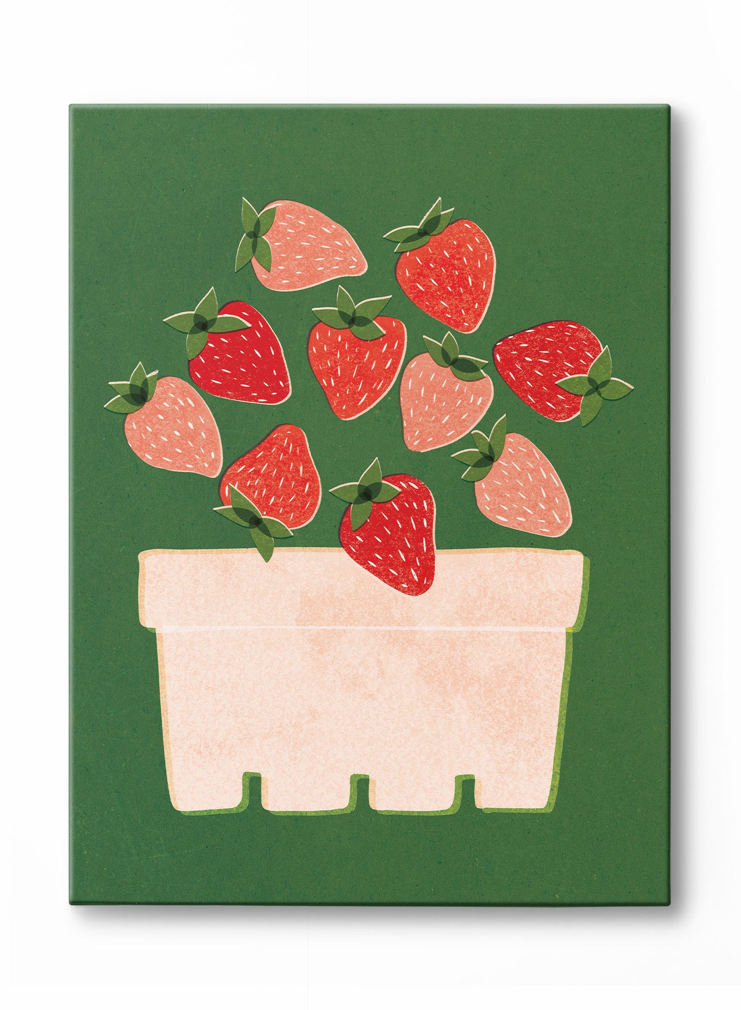 A carton overflowing with bright, juicy strawberries captures the essence of market mornings in this vibrant canvas. The deep green backdrop sets off the warm reds and soft pinks of the fruit, while the painterly texture and simple shapes give the piece a handcrafted, screen-printed quality. The strawberries seem to spill out naturally, full of energy and charm.