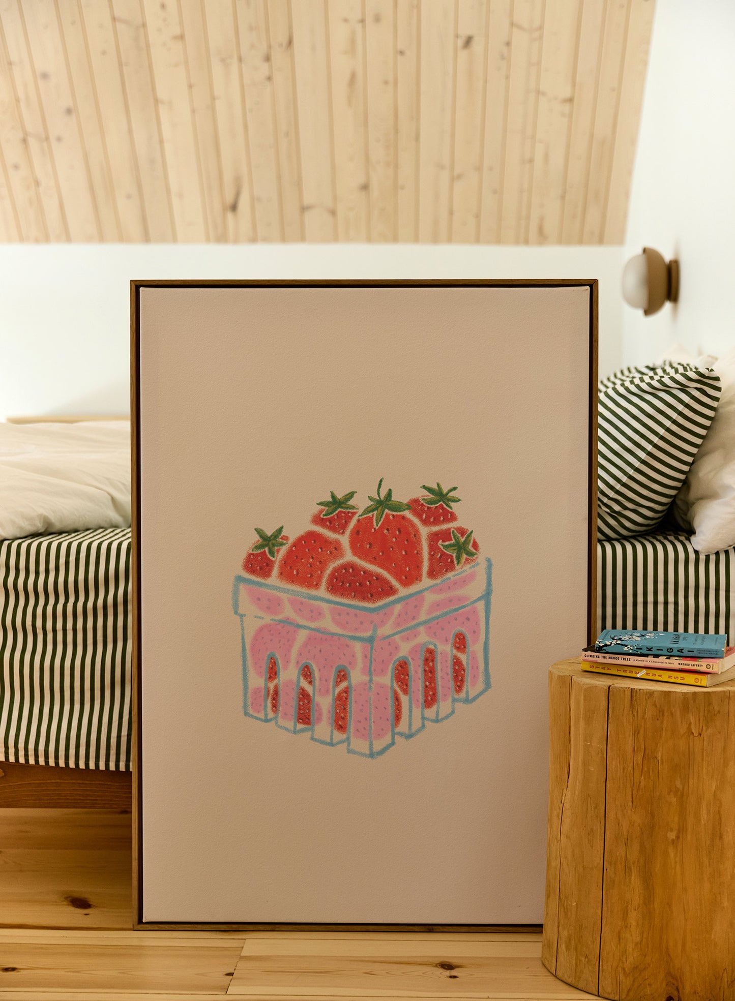 A classic berry basket, filled to the brim with plump, ripe strawberries, takes center stage in this cheerful canvas. The bright red fruit contrasts beautifully against the hand-drawn pastel container, with hints of blue and pink adding a playful touch. The painterly details highlight the natural texture of the strawberries, making them feel almost tangible.