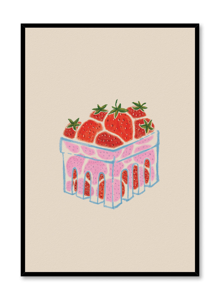 A classic berry basket, filled to the brim with plump, ripe strawberries, takes center stage in this cheerful print. The bright red fruit contrasts beautifully against the hand-drawn pastel container, with hints of blue and pink adding a playful touch. The painterly details highlight the natural texture of the strawberries, making them feel almost tangible.