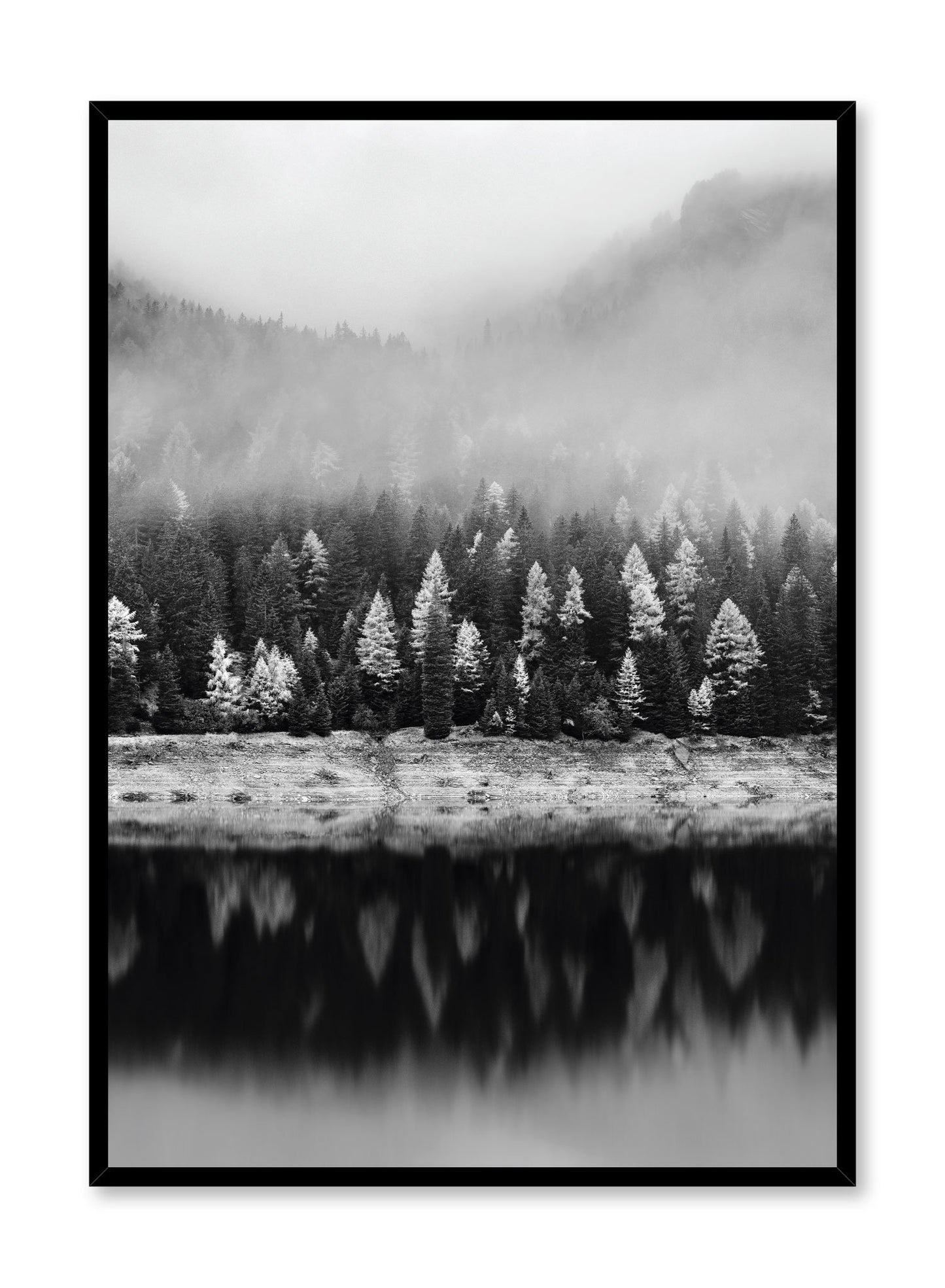 Shrouded in low misty clouds, this mountain-scape’s mirrored reflection is breathtaking, offering serenity and calm to any wall art display.