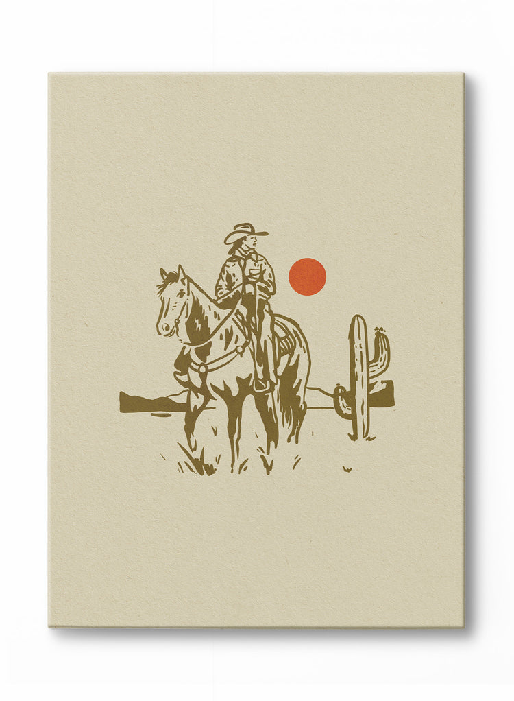 Add a touch of the Wild West to your decor with this canvas featuring a cowboy and cactus. The minimalist design in earthy tones is perfect for rustic and Western-themed spaces.