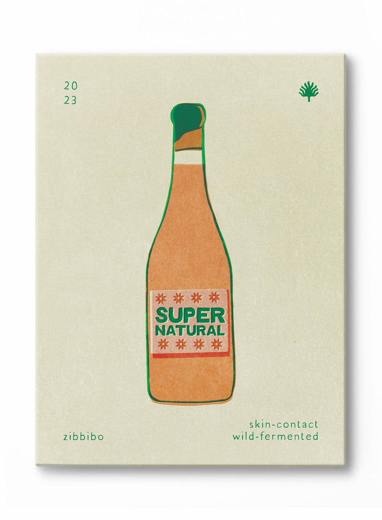 This graphic canvas is a stylish nod to the world of natural wine. An illustrated bottle of orange wine is labeled "Super Natural," with details identifying it as "Zibbibo," "skin-contact," and "wild-fermented." The design is both educational and artful, celebrating a modern approach to winemaking with a playful, retro aesthetic.