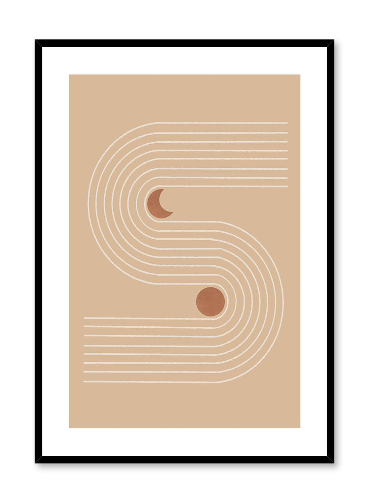 The ‘Taking Turns’ art print is a beautiful metaphor for the passing of time and the rotation of the sun and moon. This boho and minimalist poster features a vintage-style ‘ curve in the shape of an ‘s’. Minimalist sun and moon symbols hide in the nook created by the curved lines. This print’s beige and rust-brown color palette will instantly warm-up your bohemian space.