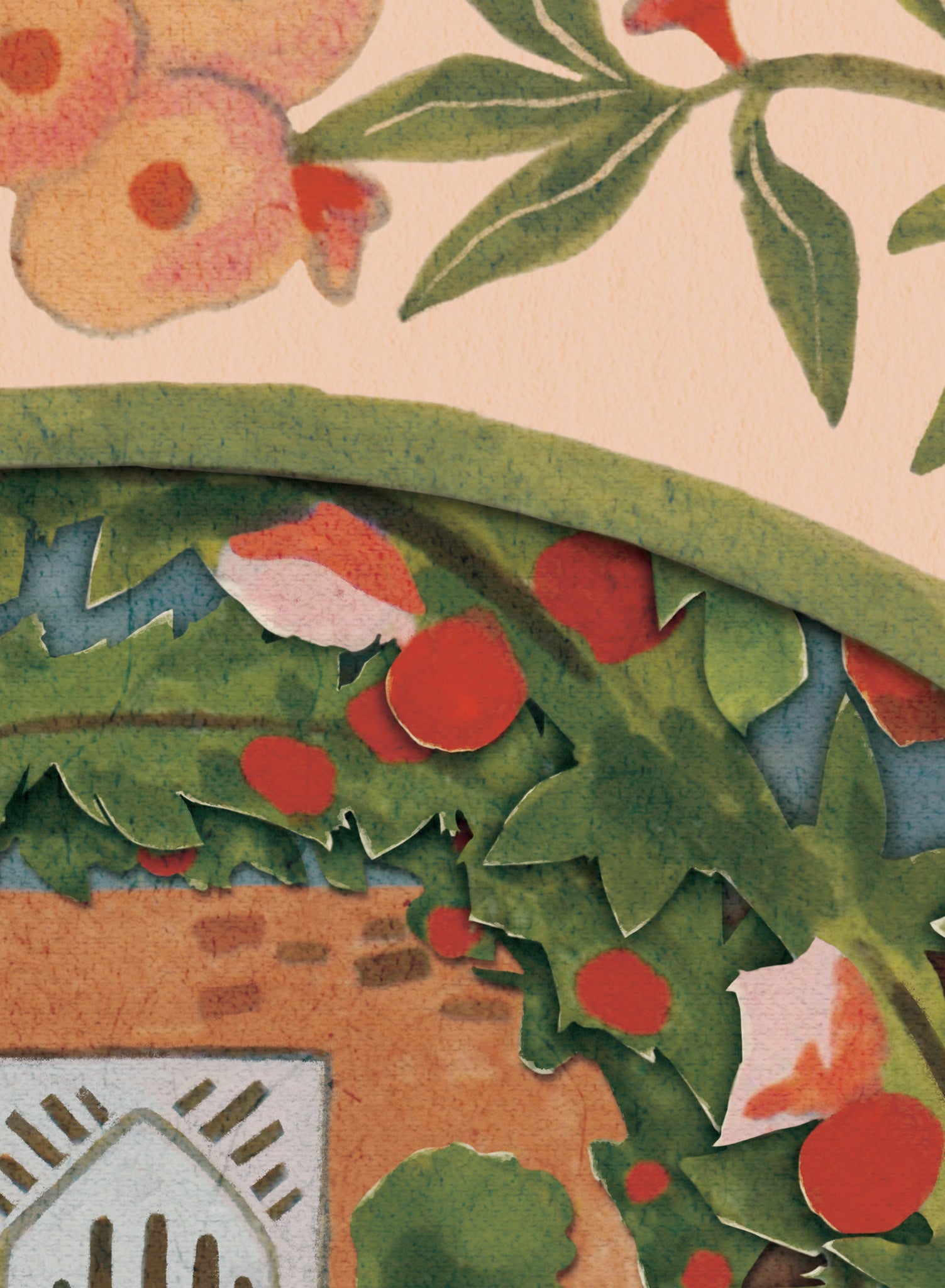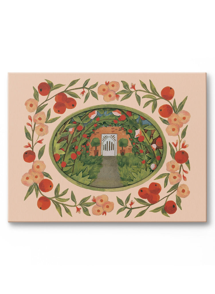A quaint garden path leads to a charming white gate, framed by lush greenery and vibrant blooms. The scene is encircled by a delicate wreath of painted flowers and ripe red apples, set against a soft peach background. This canvas captures a moment of serene beauty, inviting viewers to imagine the stories that lie beyond the gate.