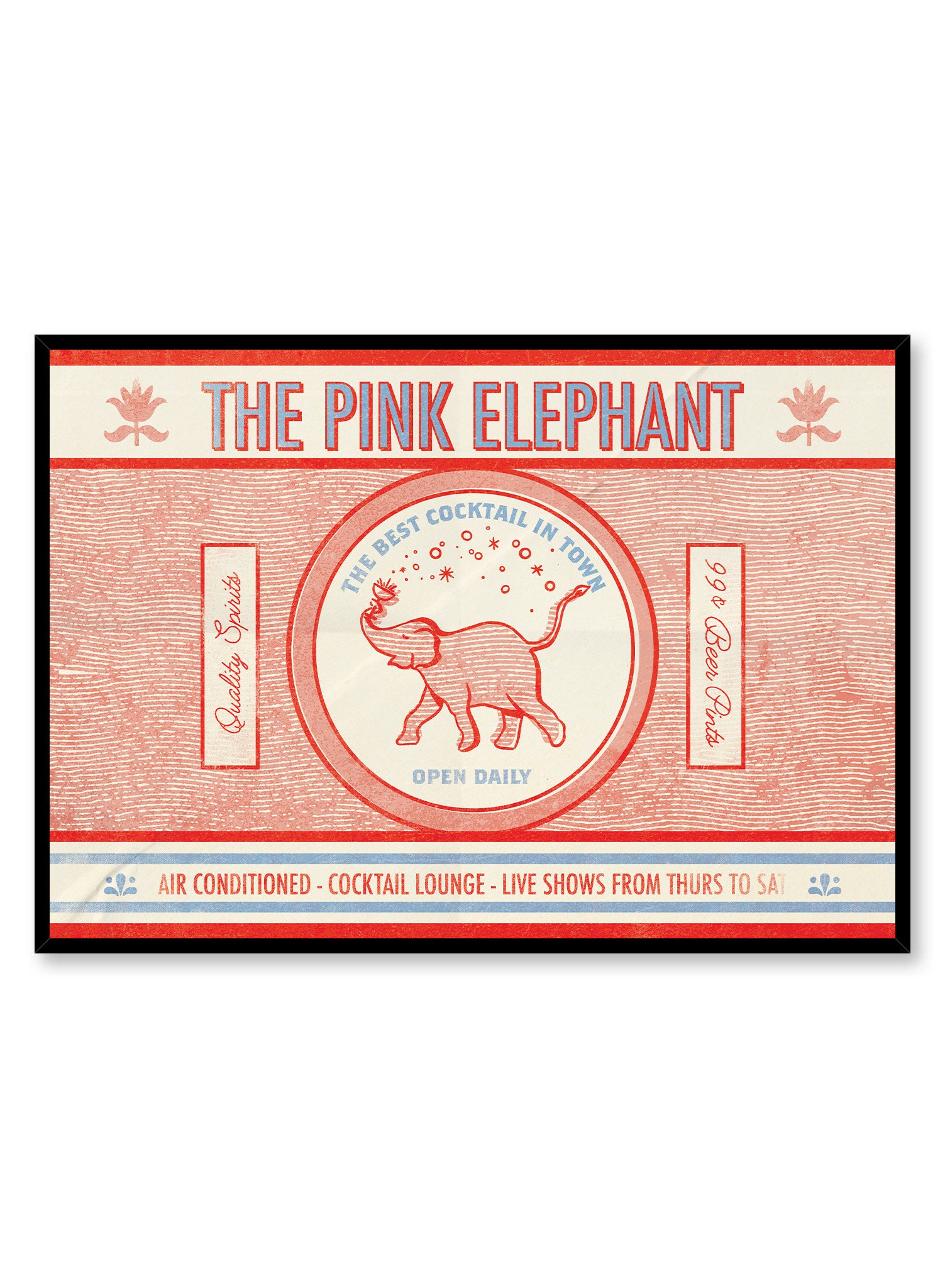This print is a retro-inspired advertisement for "The Pink Elephant," a fictional cocktail lounge. Featuring a charmingly illustrated elephant balancing a drink on its trunk, the design is filled with vintage typography and classic details like "Quality Spirits" and "Air Conditioned." It’s a whimsical piece of ephemera that evokes mid-century bar culture.