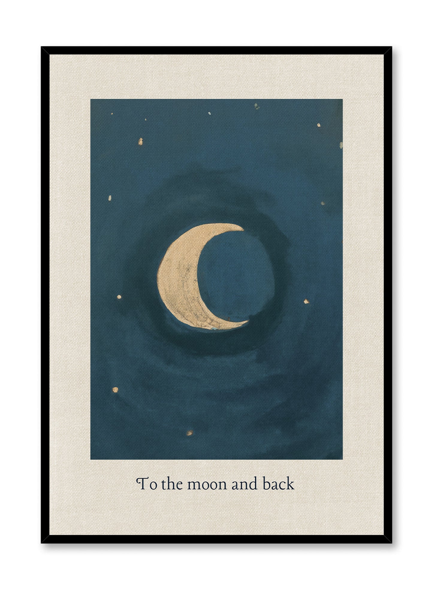 This minimal yet evocative art print features a golden crescent moon floating in a deep teal sky, surrounded by a gentle scattering of stars. Beneath the moon, the words 'To the moon and back' are delicately inscribed, adding an emotional and poetic touch to the piece.