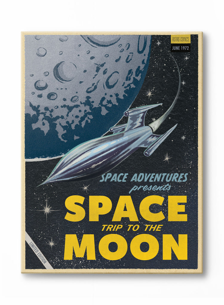 Embrace the excitement of space exploration with this 'Space Trip to the Moon' canvas. Showcasing a sleek rocket ship against a starry night sky, it's perfect for adding a futuristic touch to your decor.