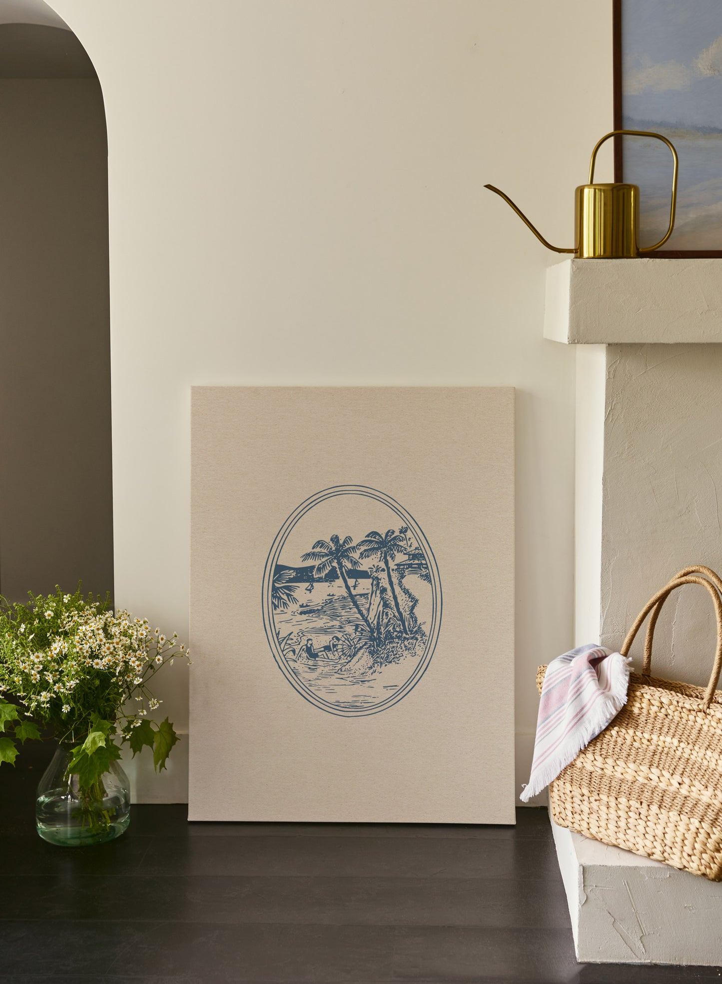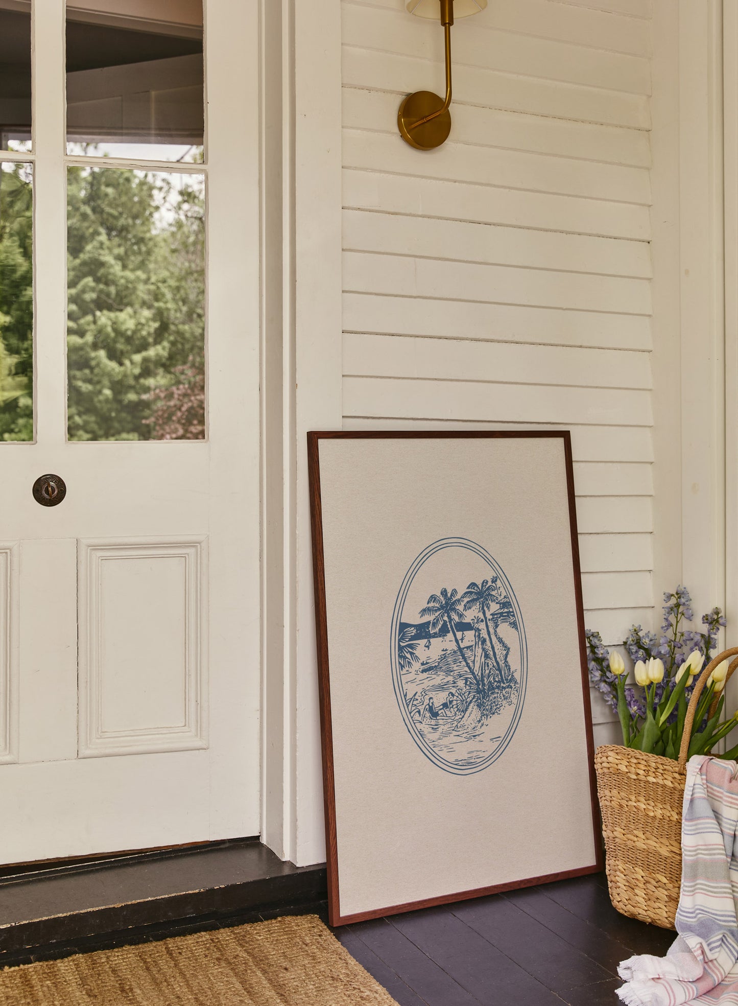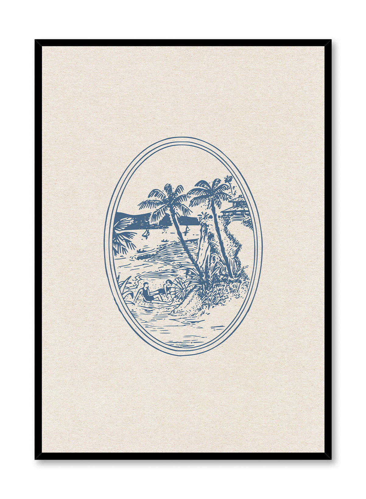 Like a window into the perfect summer memory! An oval frame holds a blue vintage illustration of tropical palm trees and waves crashing into a sandy beach.