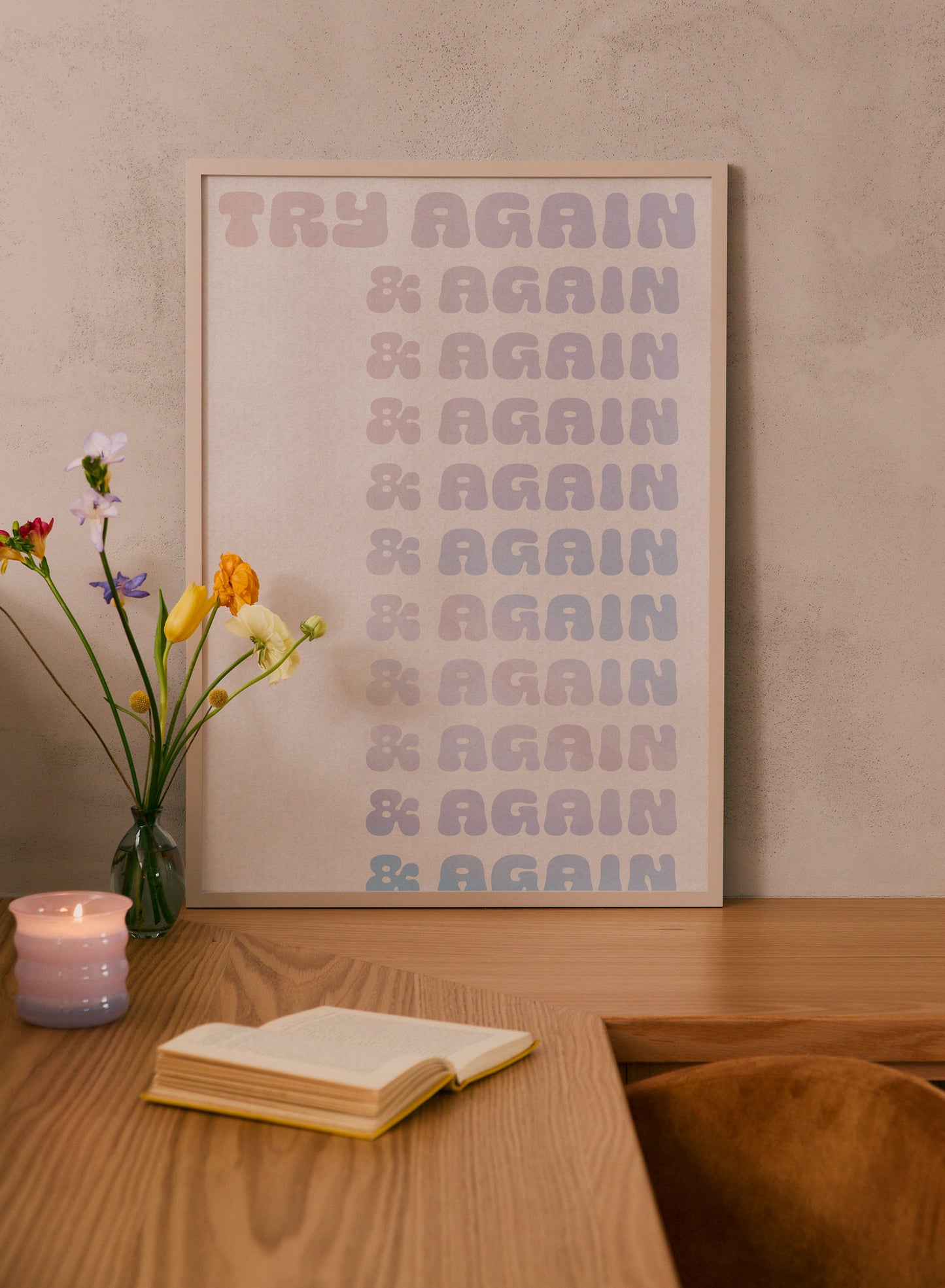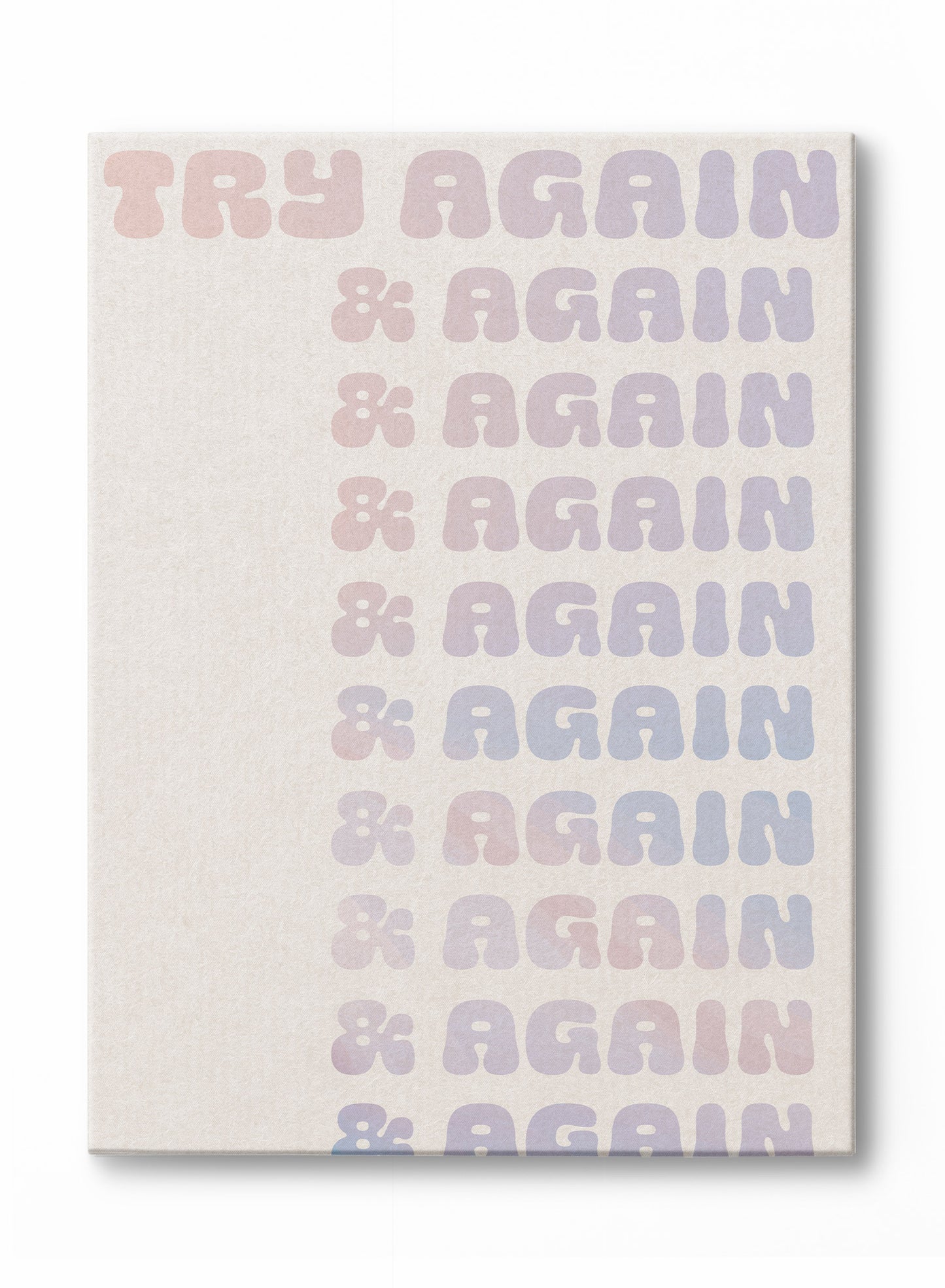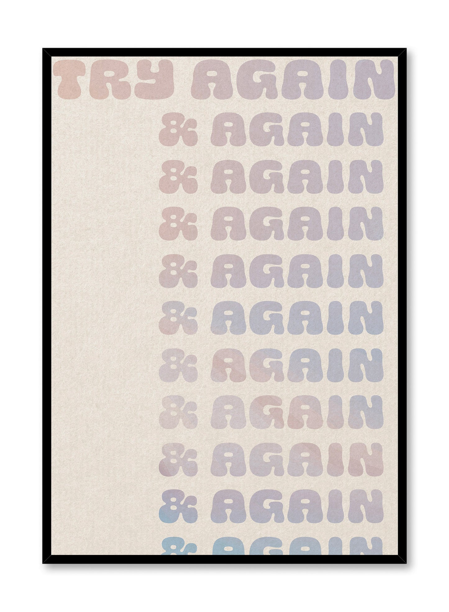 If at first you don't succeed, Try Again! This motivational typography poster features a repetition of the words "try again" in pink and purple gradient lettering over a beige background.