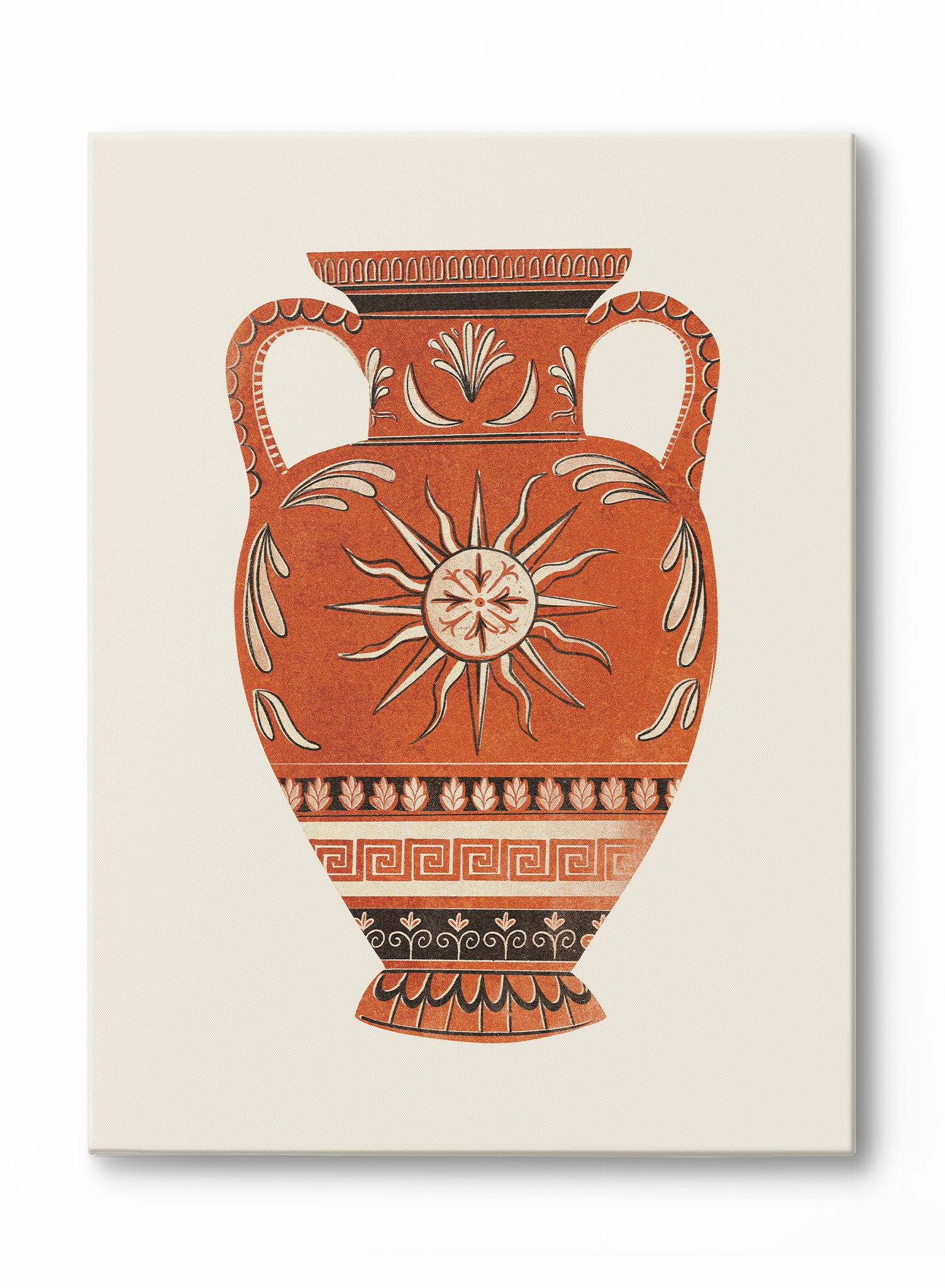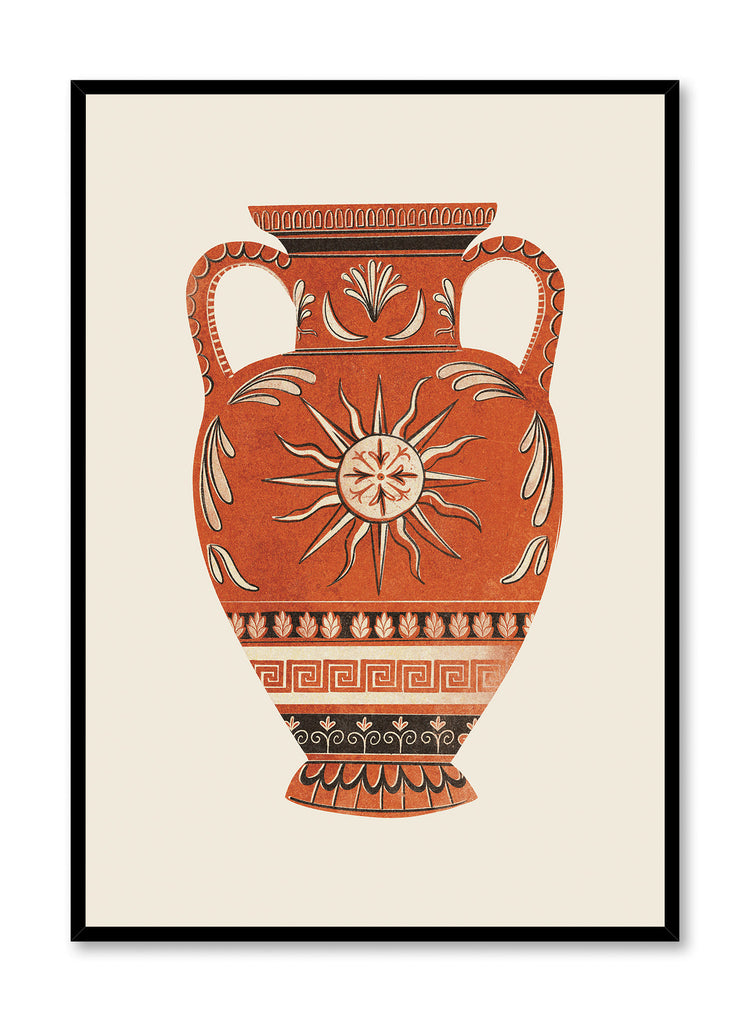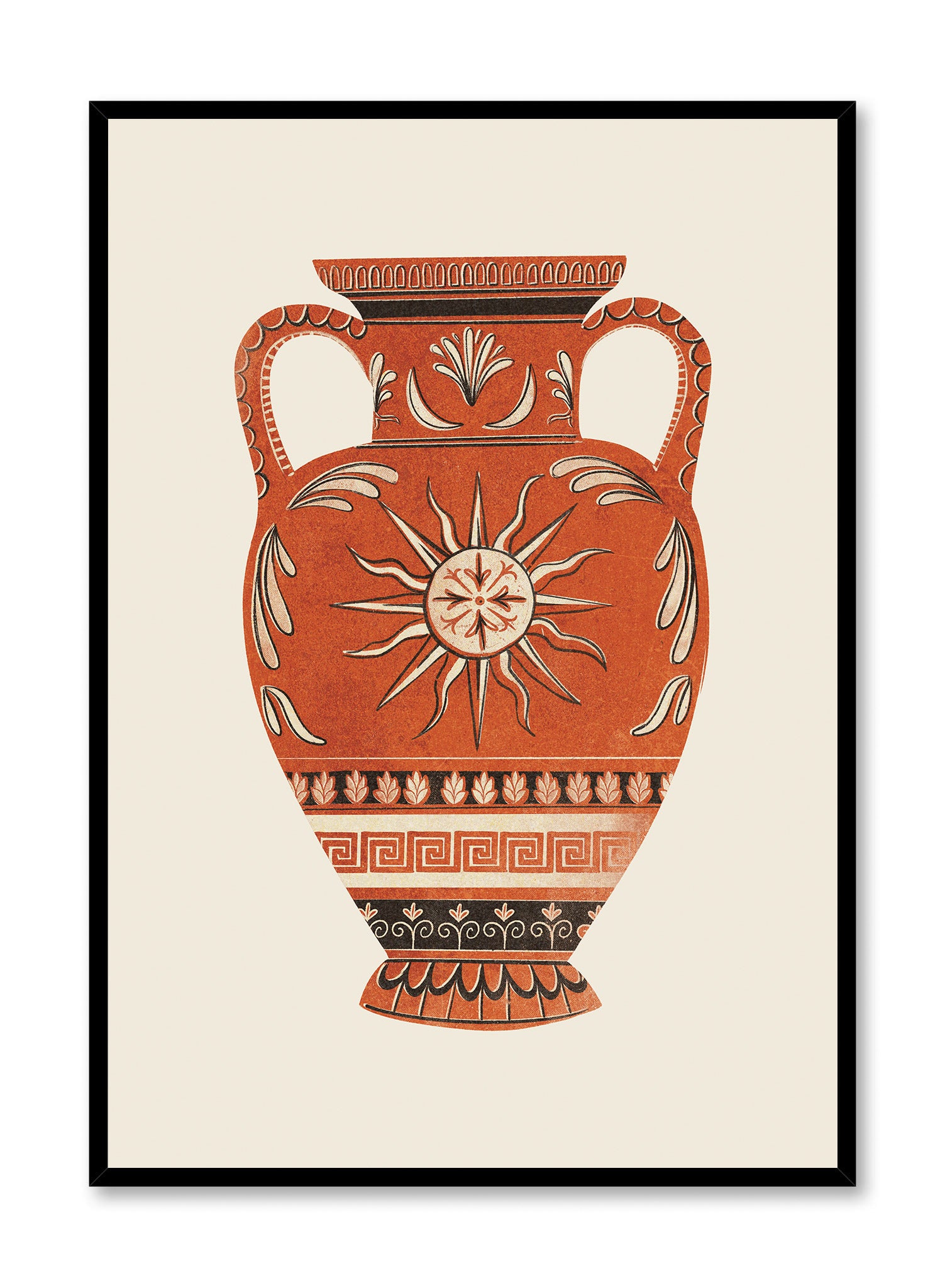 This print showcases a meticulously detailed illustration of a classical amphora, a nod to the rich artistic history of the Mediterranean. The vessel’s elegant, curved form is decorated with an array of traditional motifs, including a Greek key design, delicate palmettes, and a prominent sun emblem at its center. The piece feels like a beautiful plate from a vintage archaeology text, full of history and artistry.