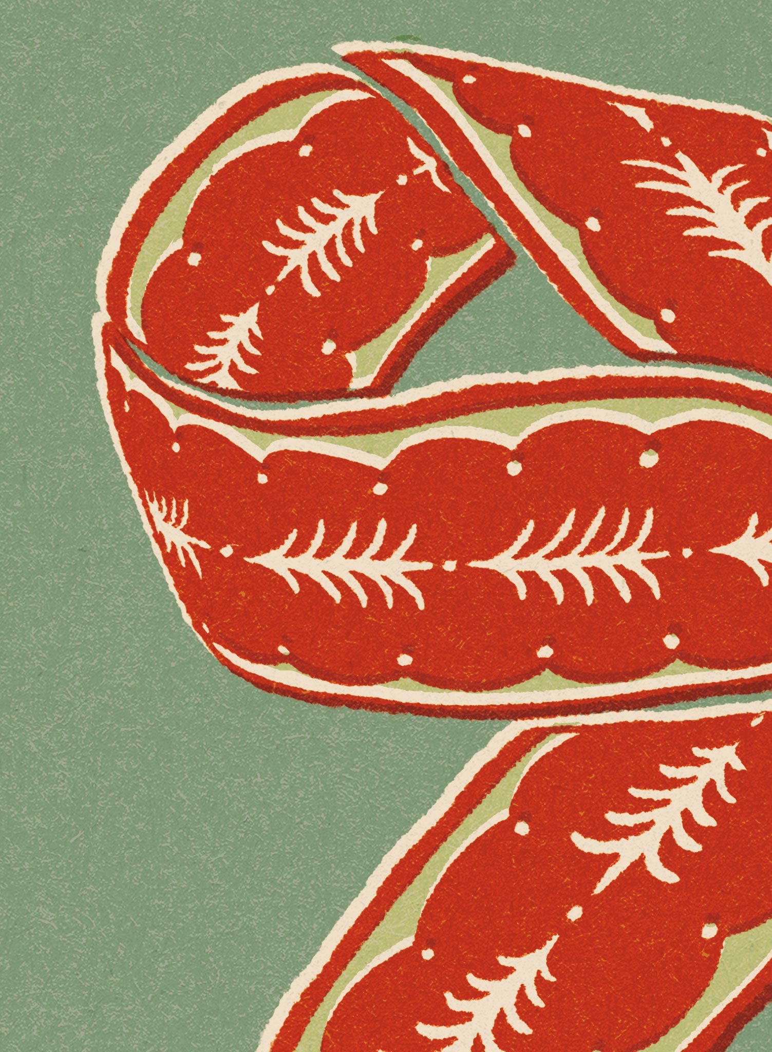 The color palette is both bold and soothing, with the red and green creating a classic holiday contrast. The delicate white detailing adds texture and depth, enhancing the visual appeal and inviting closer inspection.