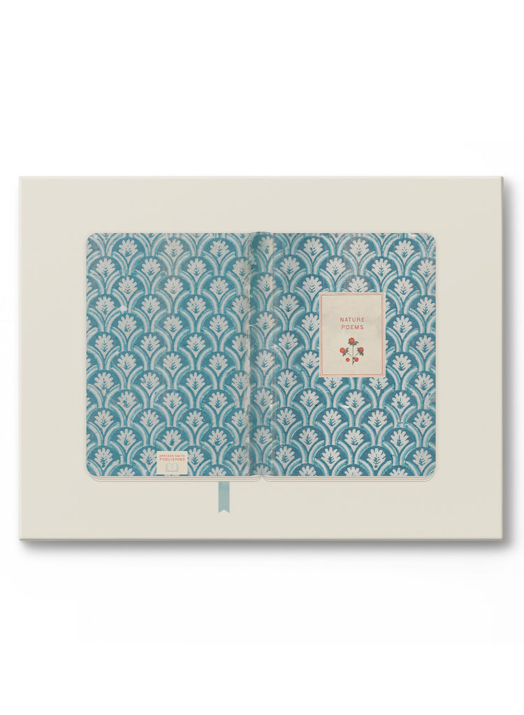 A striking open book displays intricate turquoise patterns, inspired by classic damask motifs. Its title card, "Nature Poems," adds a personal, vintage charm to this refined composition.