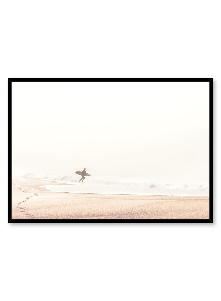 If you dream of the surf life, then this misty beach photography poster of a surfer going toward the waves is for you! Enjoy the beauty of the ocean all day with this surf-themed art print.