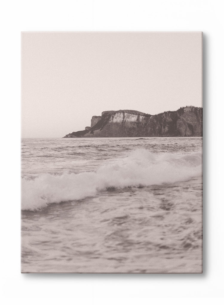 Watch your worries vanish as each wave kisses the sand. Washed Away is a sepia-toned beachside landscape composed of crashing waves and distant cliffs. This photo was taken in Gaspésie's Forillon Park in Québec.