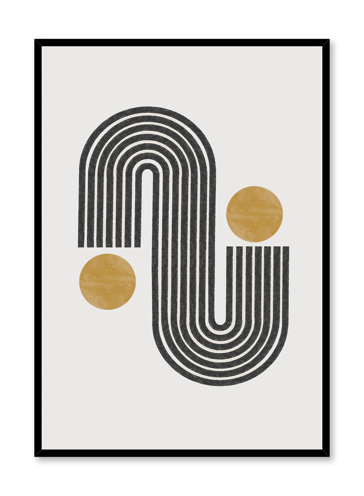Add a little sunshine to your home with Wassily, a Bauhaus-style art print highlighting a rainbow-inspired arch structure and textured yellow circles. This mid-century modern style poster features black ‘s’ shaped lines layered to create a compelling geometrical structure. With its dynamic composition and simple bauhaus vintage design, this art print will add style and sophistication to any home.