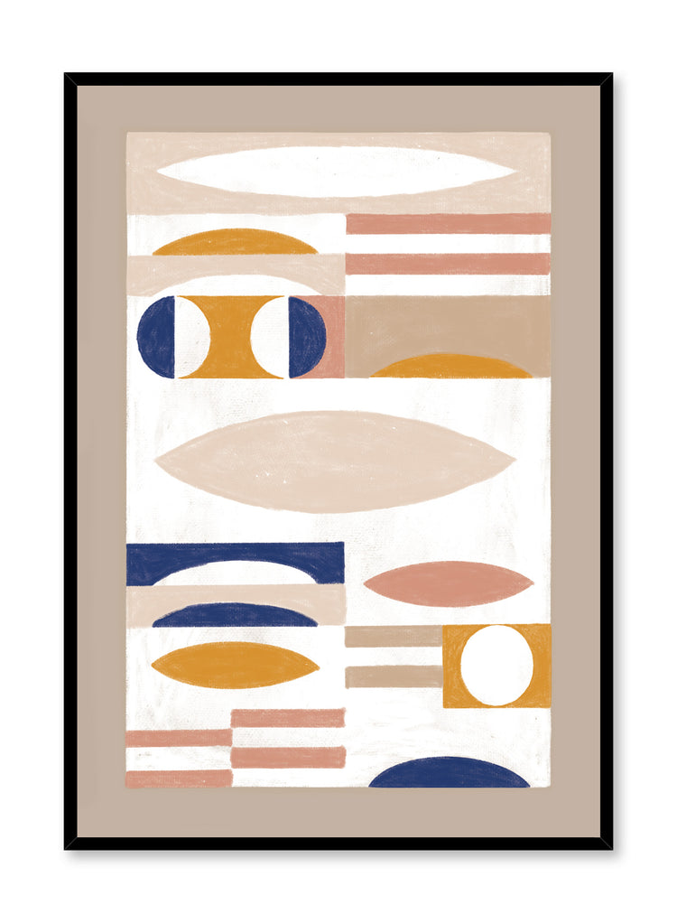 It kind of feels like this print is looking at us…And it’s okay, because we can’t stop looking at it either! The Watchful poster is a lovely neutral abstract design with subtle pops of yellow and salmon pink. The various geometric shapes are textured, which makes this contemporary print even more interesting. A tan border completes this fabulous art print.