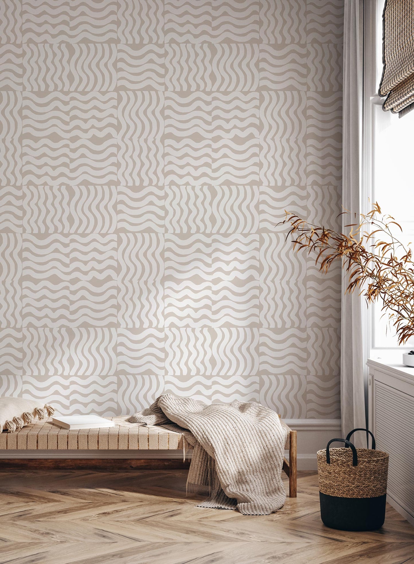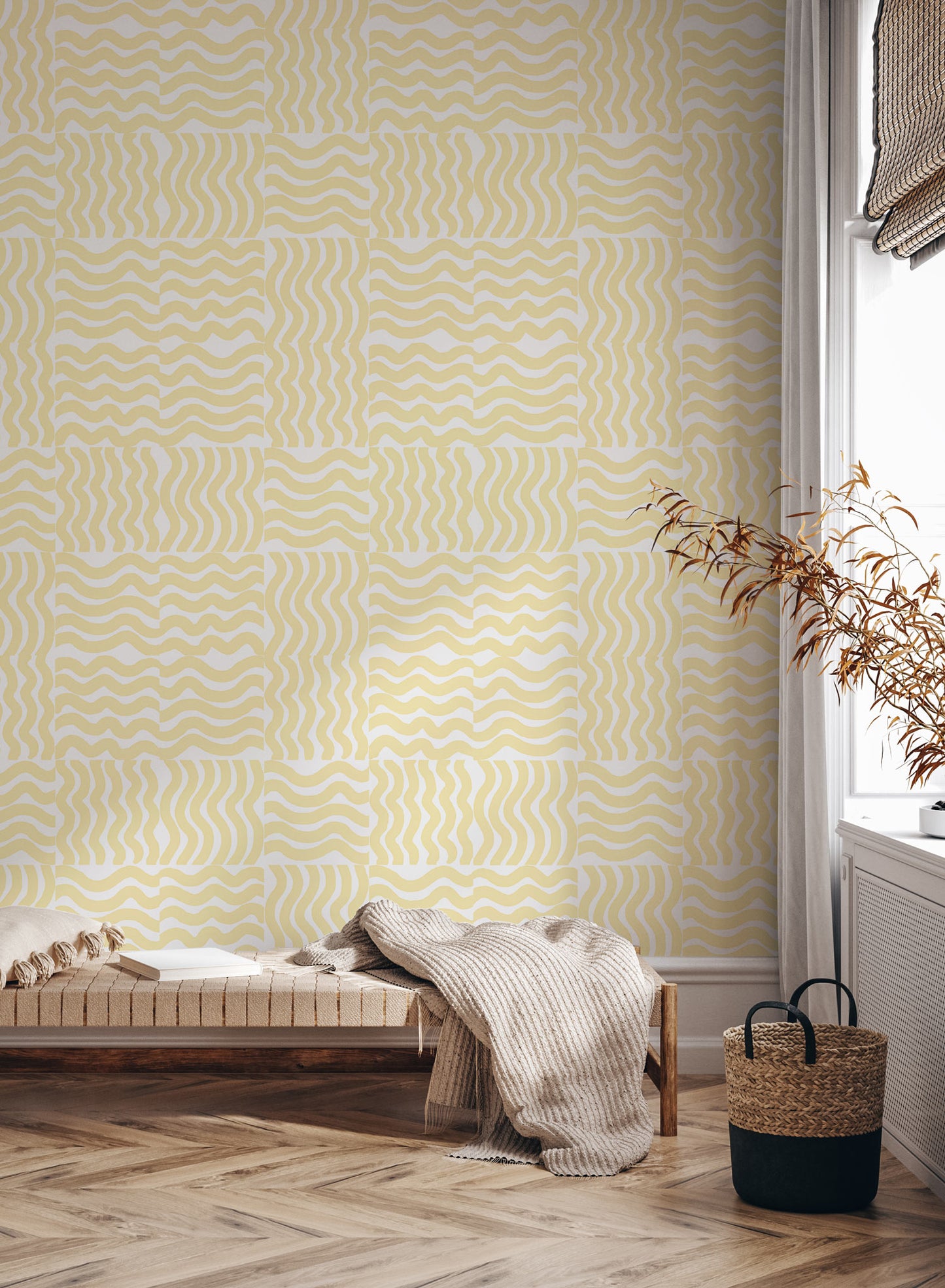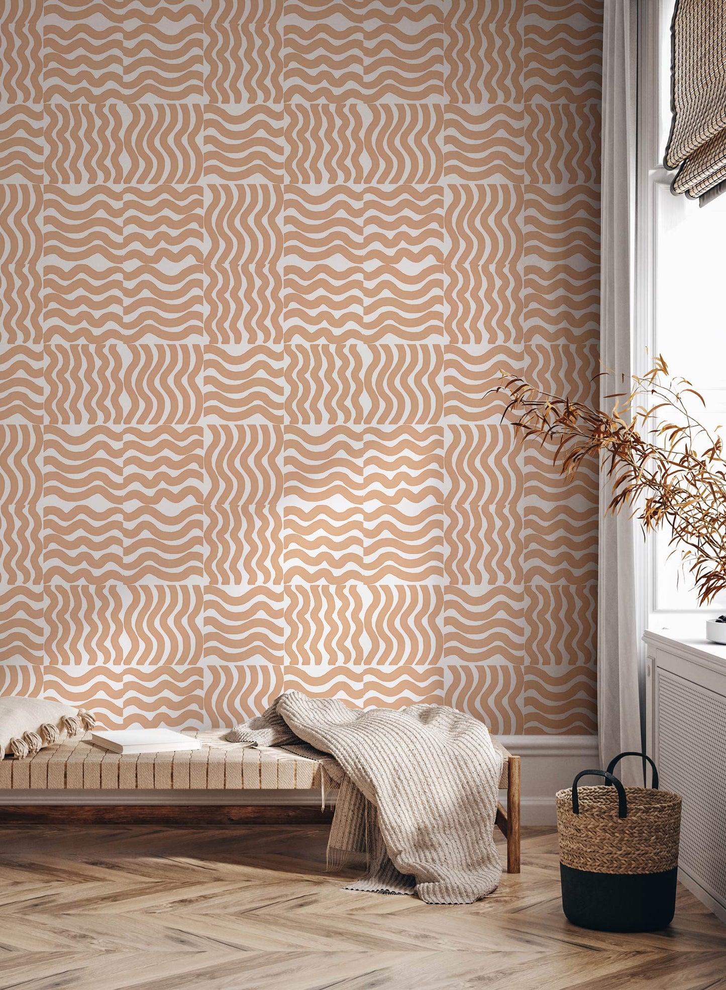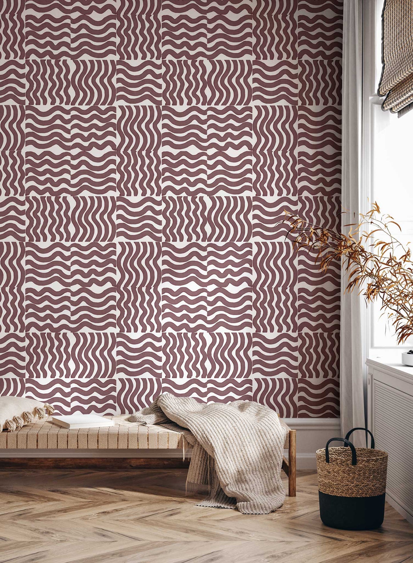 This fun maximalist wallpaper will become the new focal point in your home. The ‘Waving Around’ wallpaper features tiles of horizontal and vertical wavy lines in a cheerful color variety. Get it in the pre-pasted or removable peel & stick today.