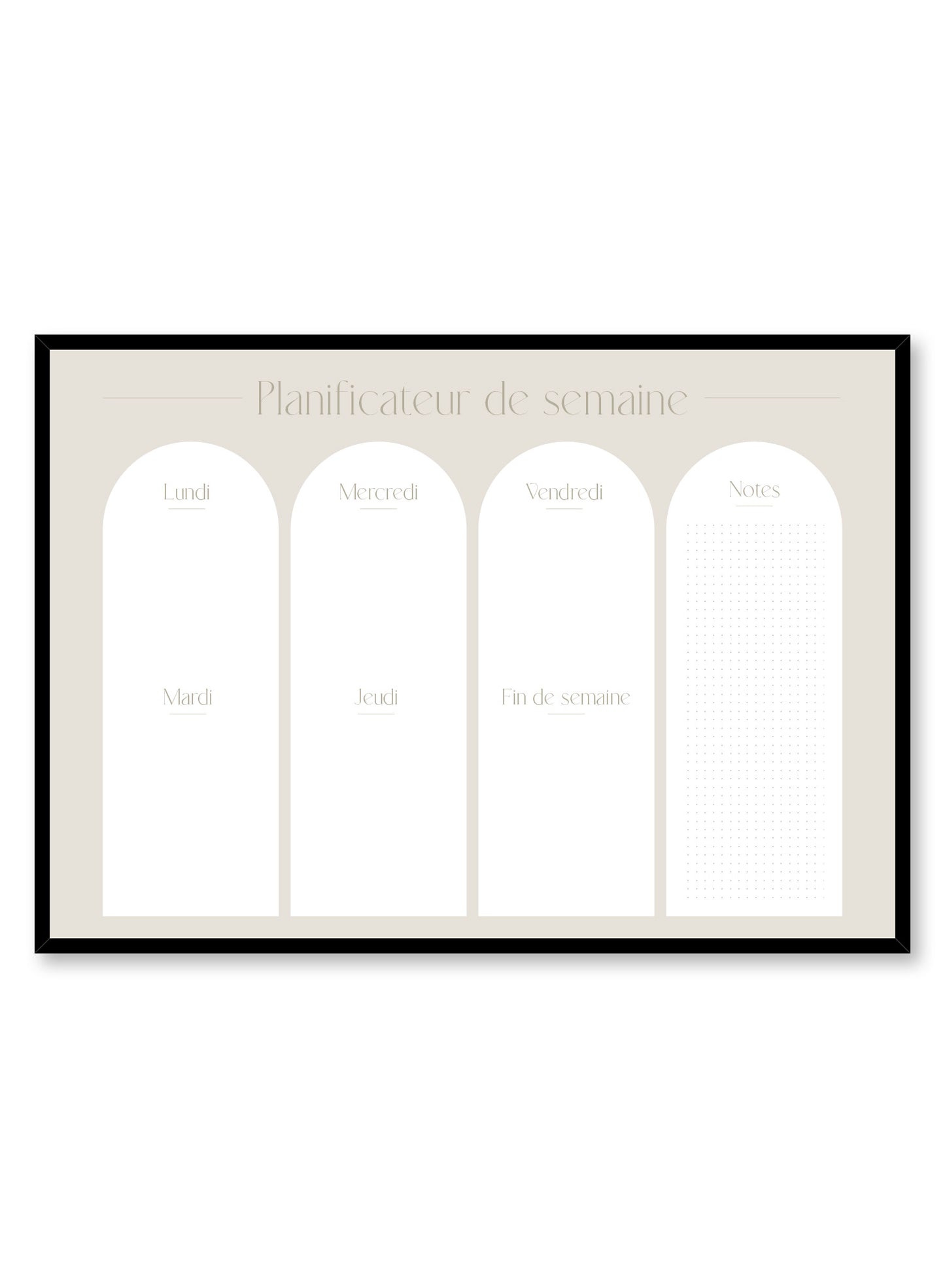 Tackle busy weeks like a pro thanks to this erasable weekly planner. This boho style planner in beige lets you keep track of important dates and events from Monday to Sunday. Jot down ideas and to-do’s in the notes section to never forget anything important ever again! This poster’s chic beige arches let you plan your week while slaying your decor!