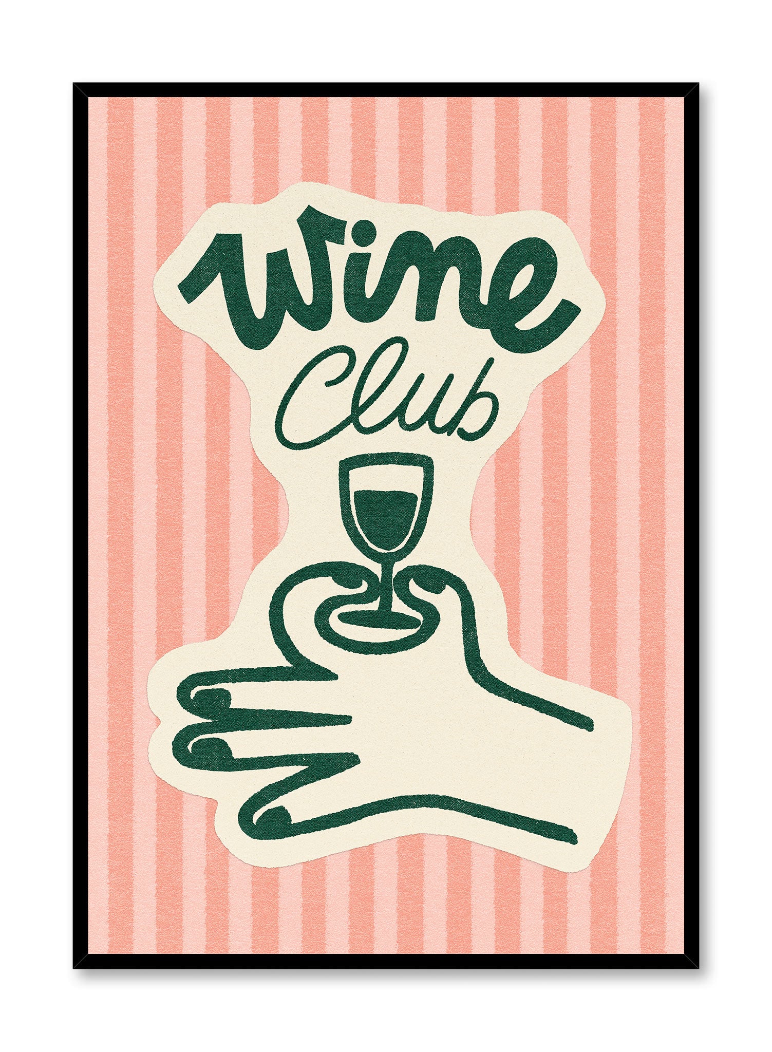 This art print features a playful, retro-style logo for a "Wine Club." A stylized hand gently holds a glass of red wine, set against a background of soft pink vertical stripes. The design has a charming, hand-cut sticker feel, with friendly, custom typography that is both whimsical and stylish.