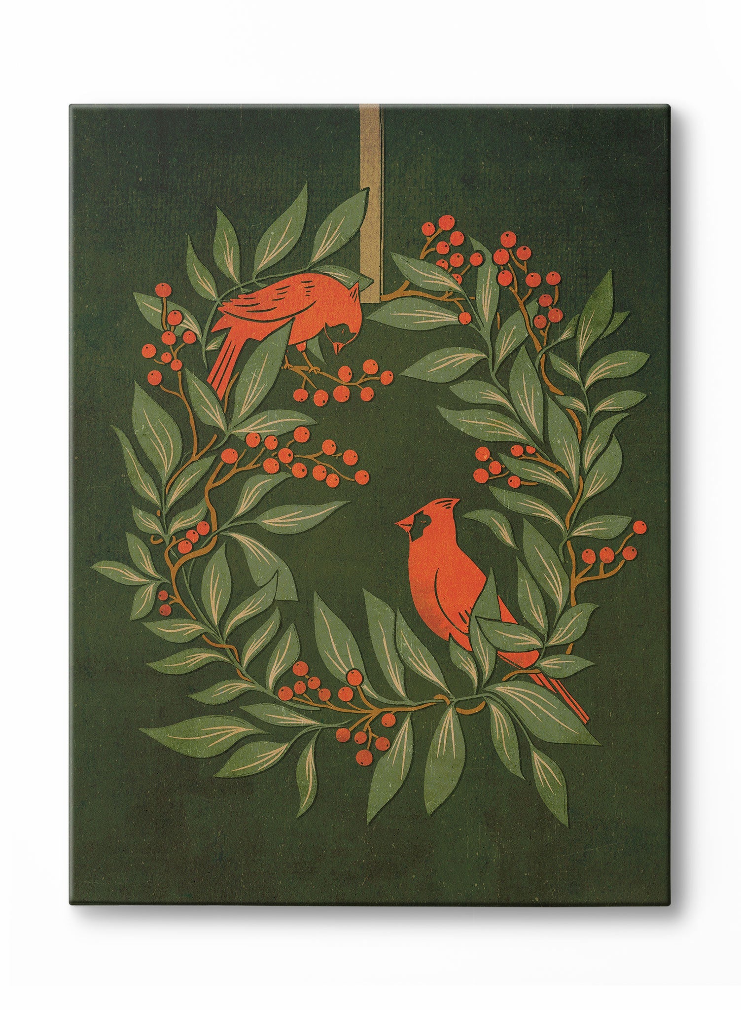 This canvas captures a serene winter scene with two vibrant cardinals perched amidst a lush wreath of green leaves and red berries. The deep green background enhances the vivid red of the birds and berries, creating a striking contrast that draws the eye. The composition is balanced and harmonious, evoking a sense of calm and natural beauty.