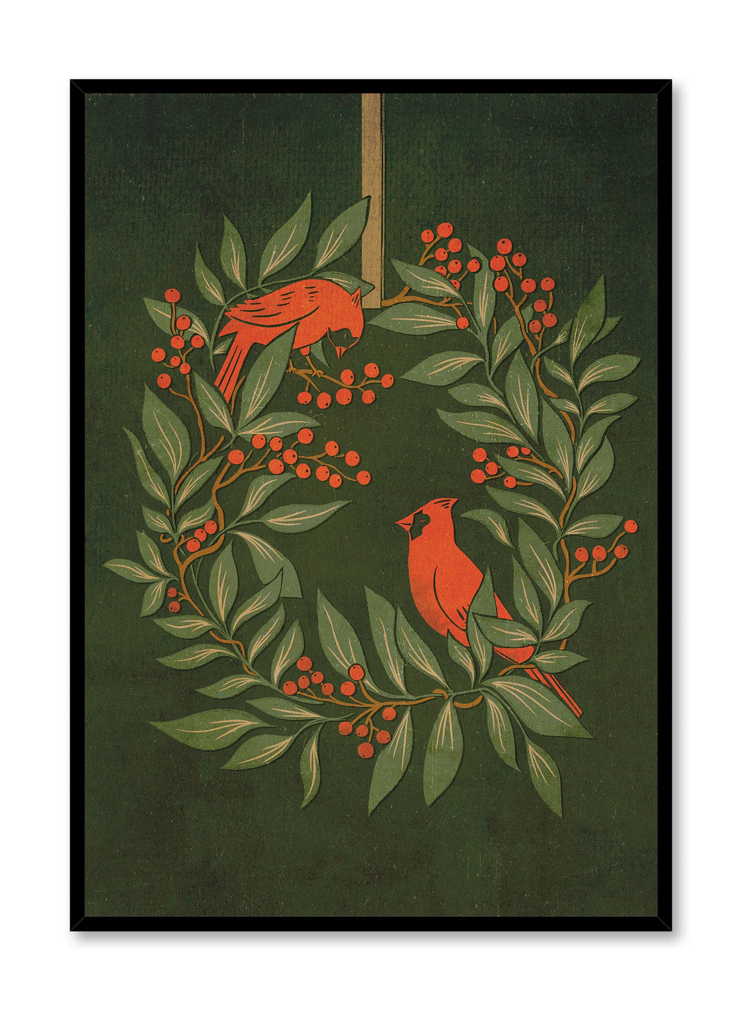This print captures a serene winter scene with two vibrant cardinals perched amidst a lush wreath of green leaves and red berries. The deep green background enhances the vivid red of the birds and berries, creating a striking contrast that draws the eye. The composition is balanced and harmonious, evoking a sense of calm and natural beauty.