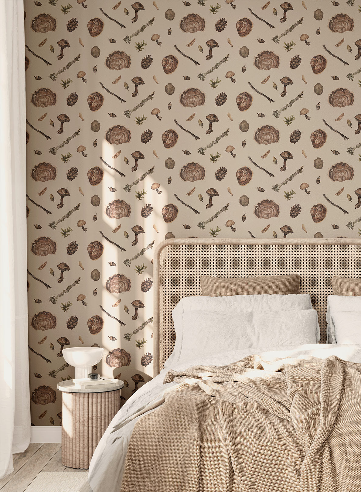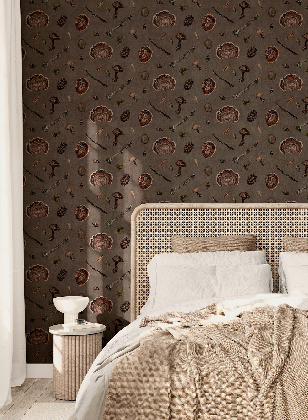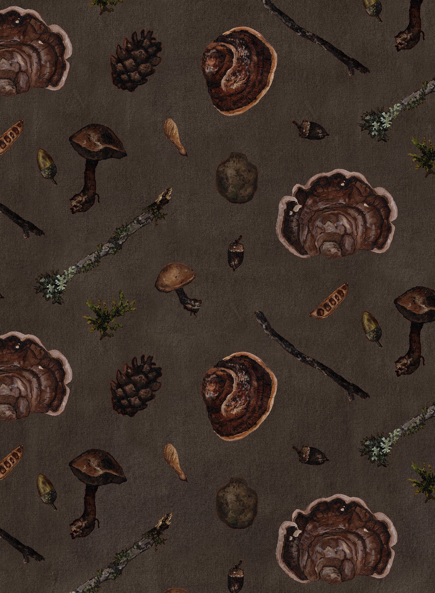 Invite the forest indoors with the 'Woodland Tapestry' wallpaper. This moody pattern is composed of various mushrooms, nuts and pine cones, beautifully layered over a textured background.
