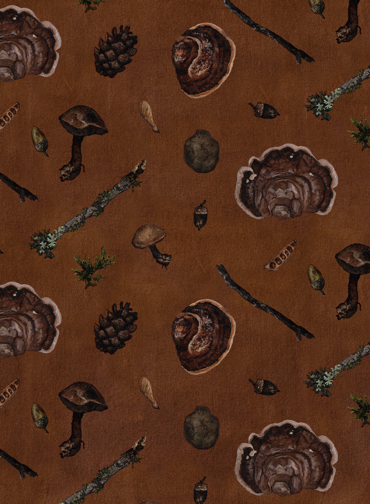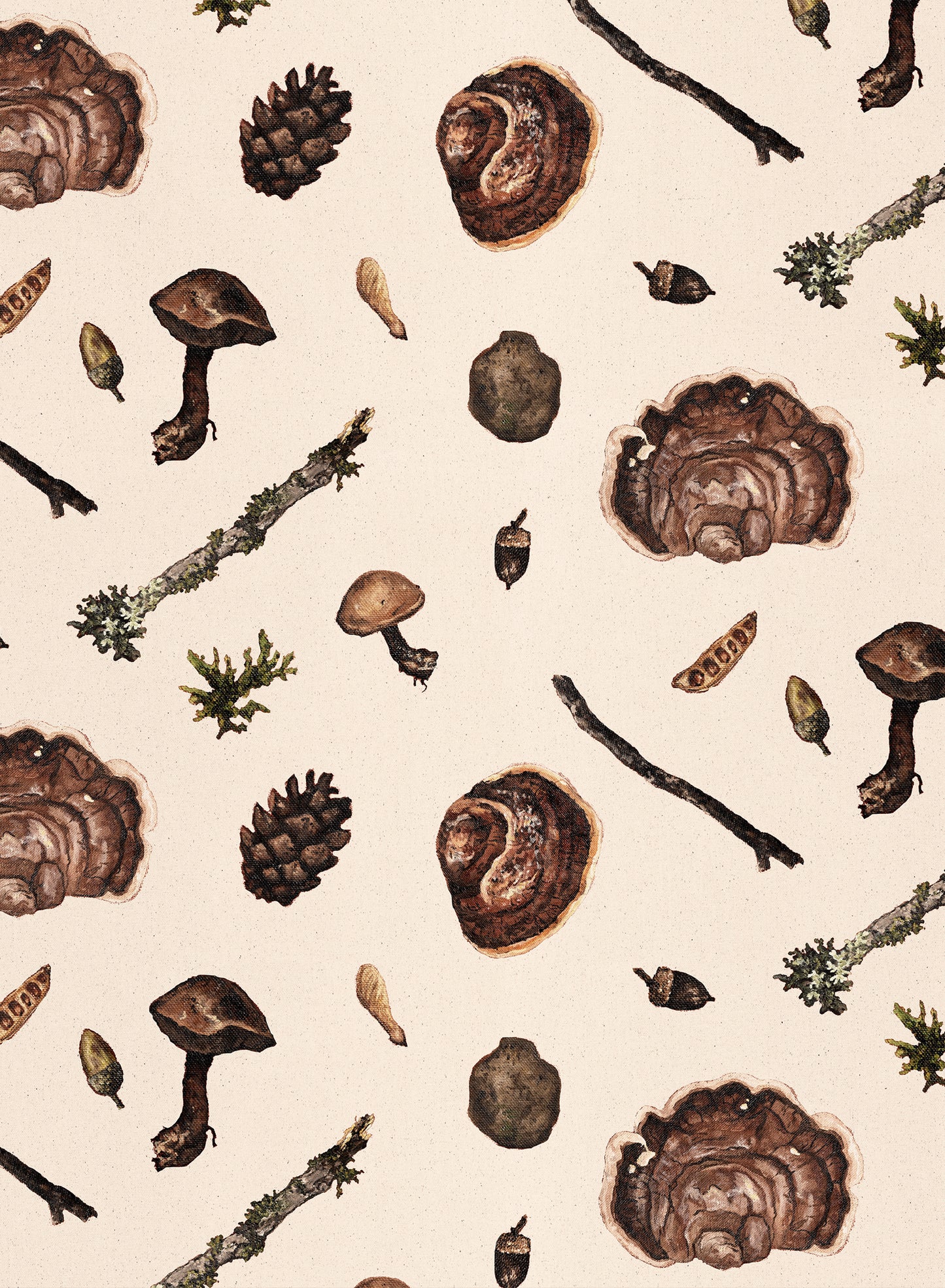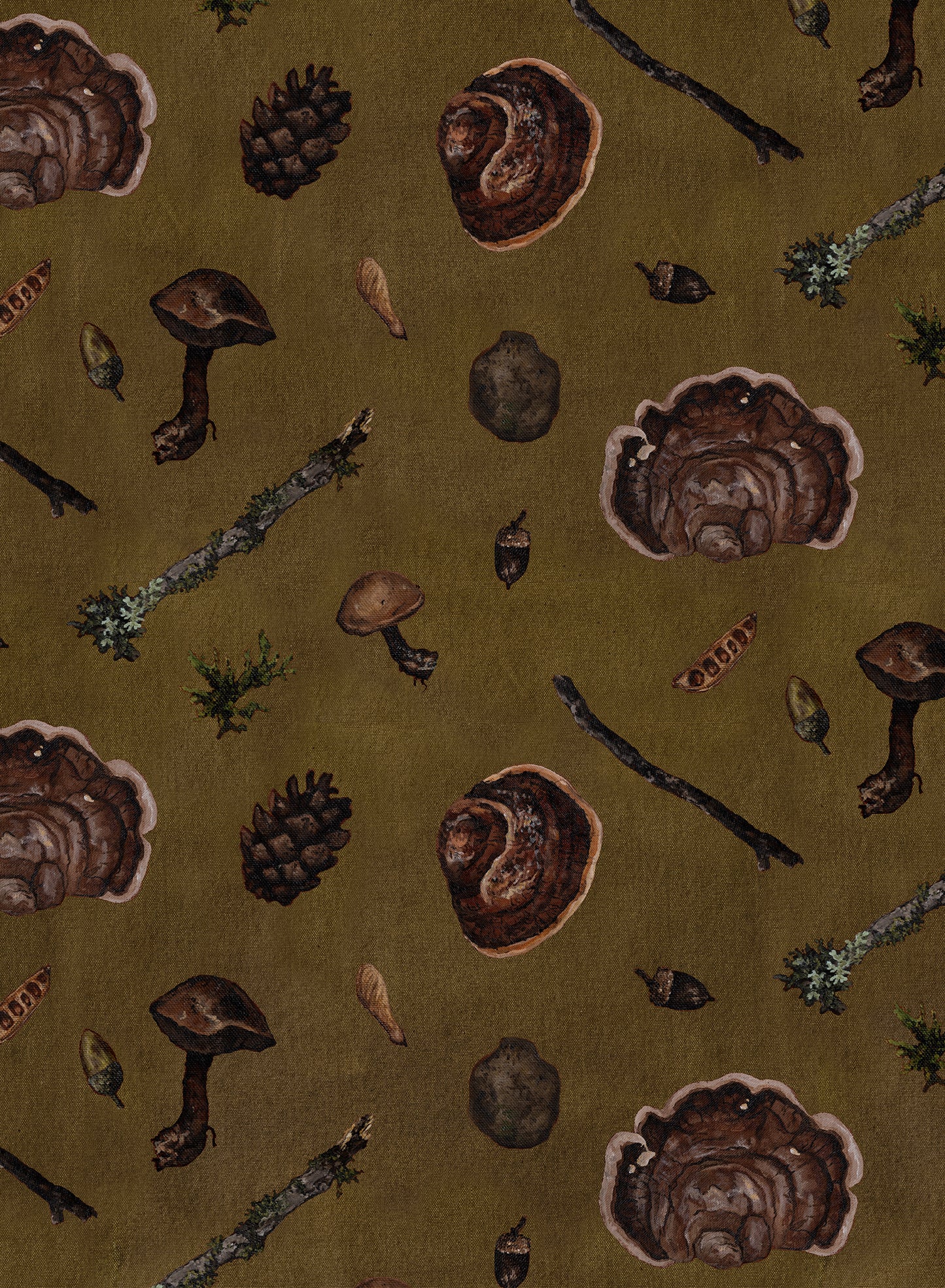 Invite the forest indoors with the 'Woodland Tapestry' wallpaper. This moody pattern is composed of various mushrooms, nuts and pine cones, beautifully layered over a textured background.