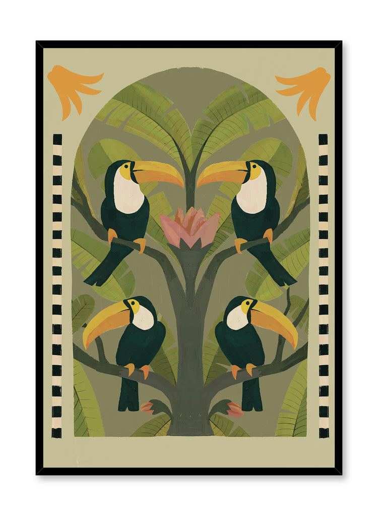 This toucan gang sure knows how to lift our spirits! The ‘Yes You Can, Toucan’ centers four colorful toucan birds perched on a gorgeous palm tree topped with a pink flower. This tropical illustration is framed by an arch and placed over a decorated green background. This jungle art is an instant mood booster AND it’ll look fabulous in your children’s decor.